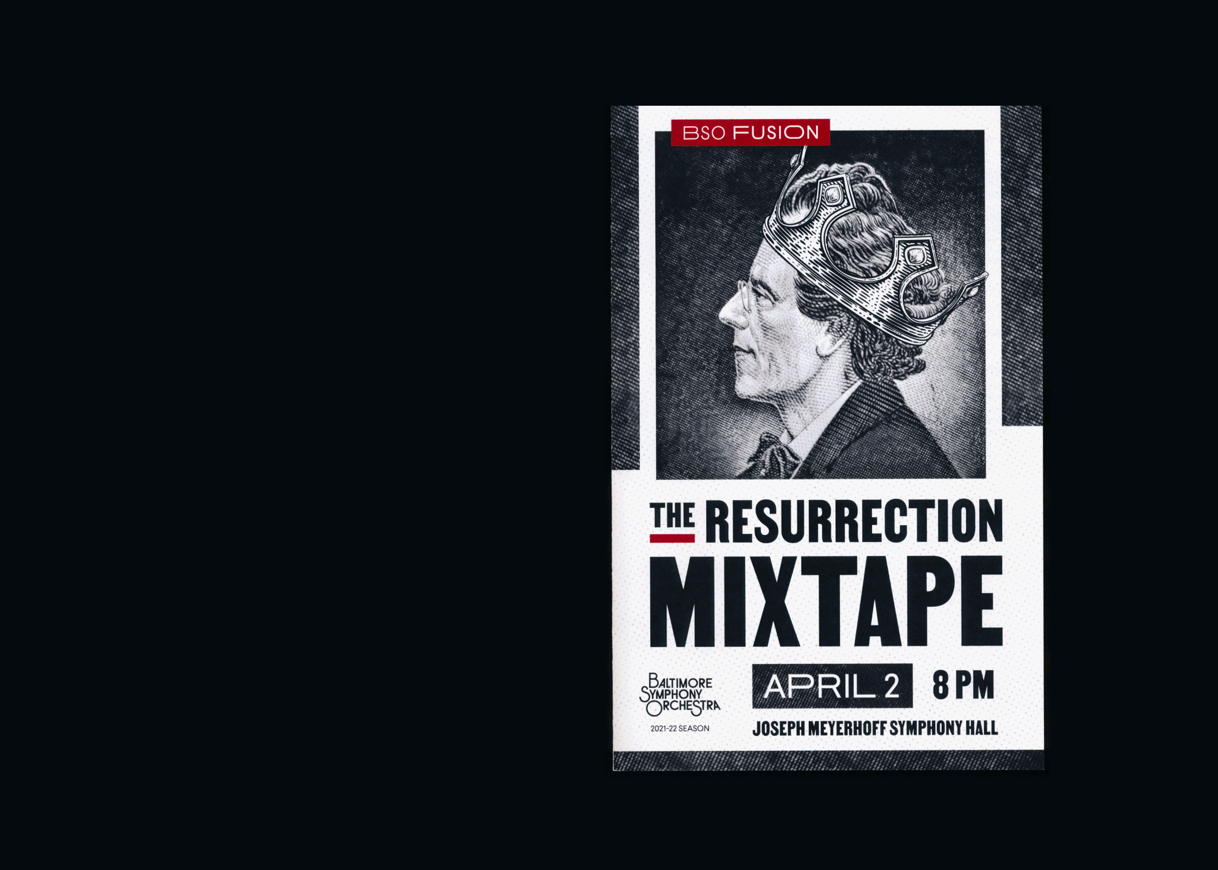 Identity and print collateral for BSO Fusion, a concert series conducted by Steve Hackman, performed with the Baltimore Symphony Orchestra. Concerts in the 2021-22 Season included Skull and Bones, Brahms v. Radiohead, and The Resurrection Mixtape. Each performance remixes the works of classical composers with the songs of artists like Adele, Post Malone, The Notorious B.I.G. and 2Pac.