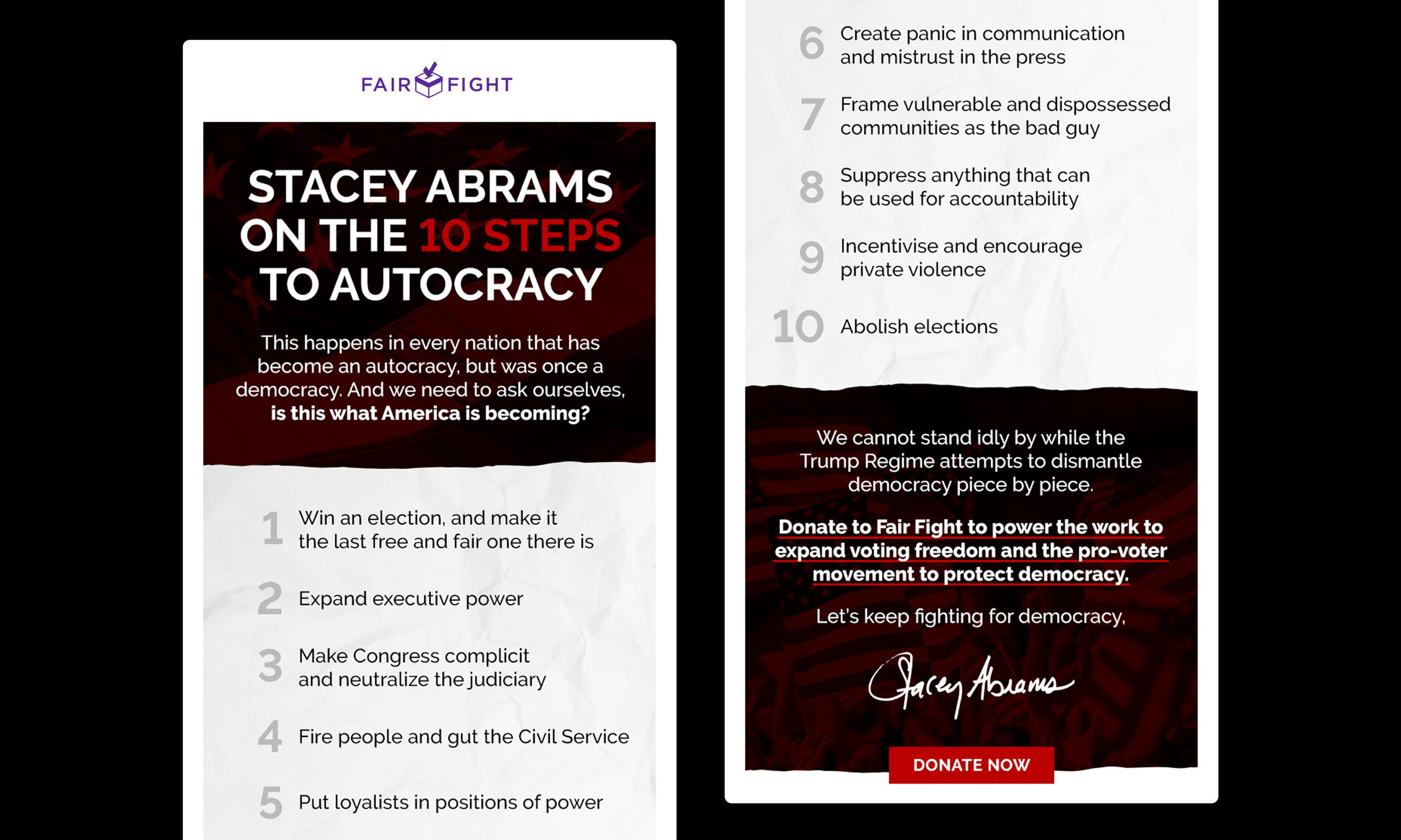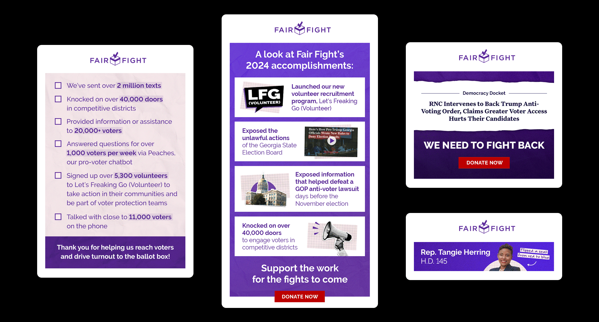 Various emails were also created for Fair Fight’s email program, to engage and inform their audience of recent news and accomplishments.